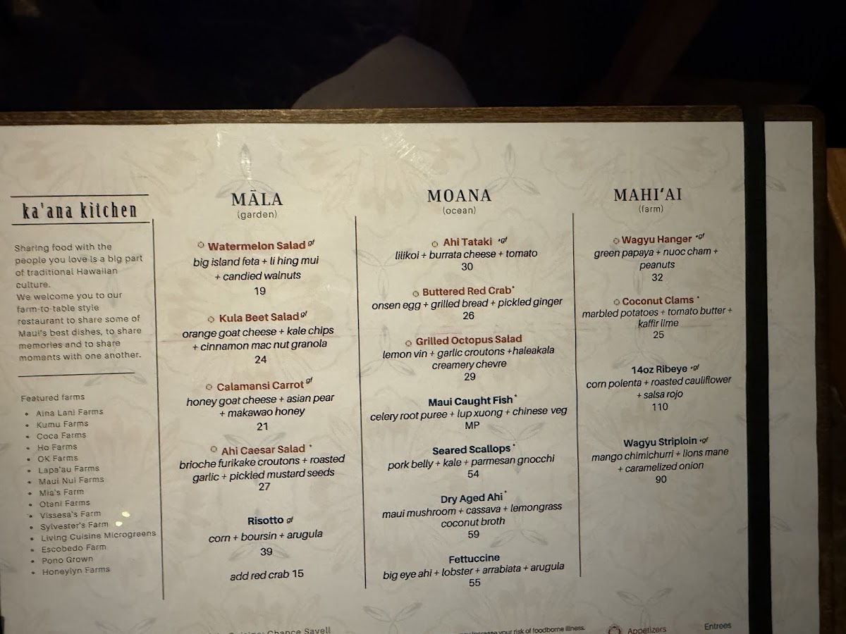 Welcome to Ka'ana Kitchen, a culinary gem nestled in Wailea, Hawaii. Known for its Hawaiian-Asian fusion, the restaurant offers a captivating menu that showcases bold flavors and innovative dishes. Diners rave about the exquisite dishes, from the tender hanger steak to the delectable buttered red crab, all crafted by a dedicated team of chefs. Guests enjoy a relaxed yet attentive dining experience, enhanced by live music and stunning sunset views.